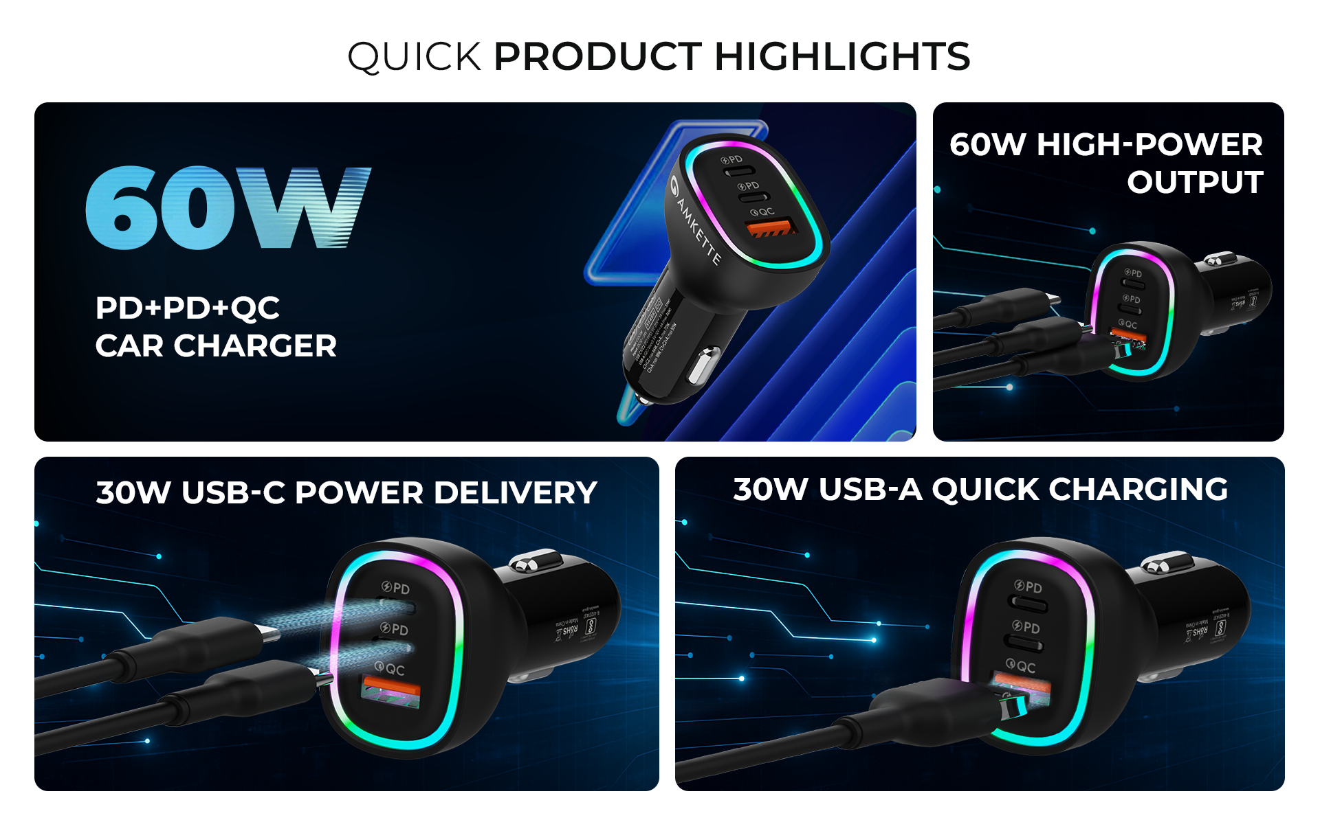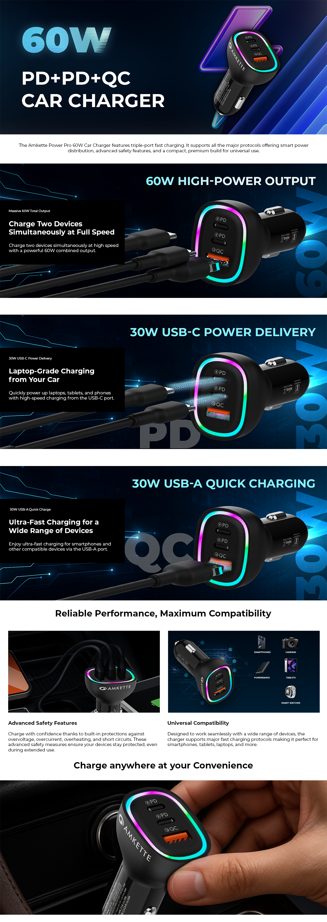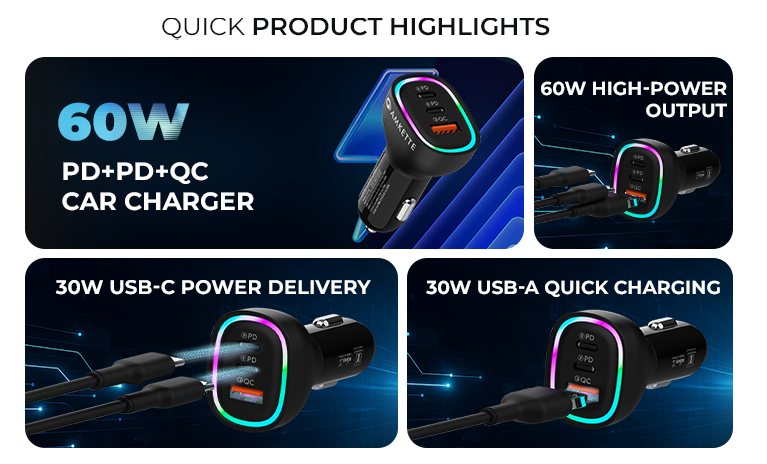 The charger delivers up to 60W (30W from each USB-C port or 30W combined with USB-A).