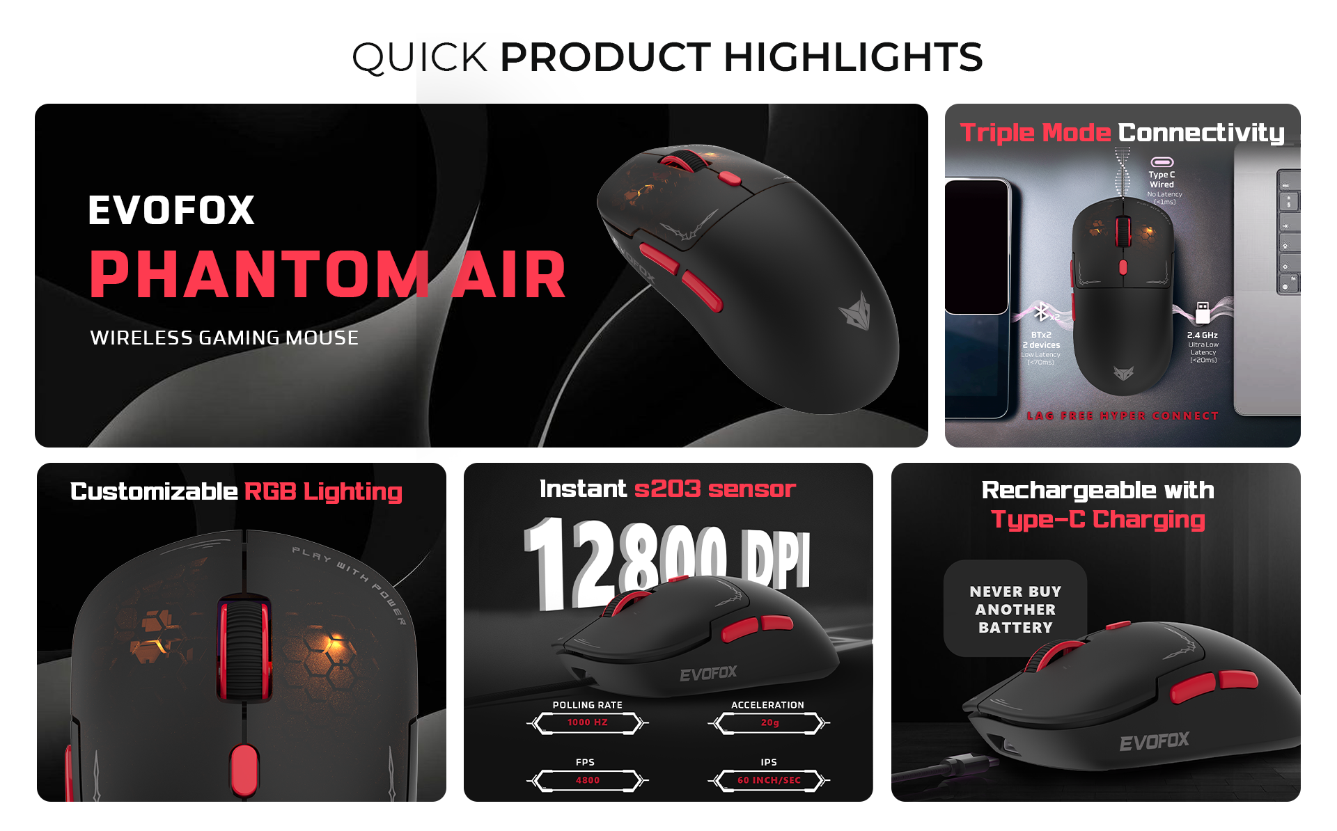 Wired and 2.4GHz modes offer up to 1000Hz polling rate for high-performance, low-latency gaming, while Bluetooth provides convenient multi-device connectivity with efficient power usage.