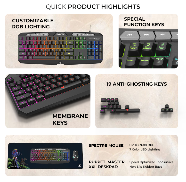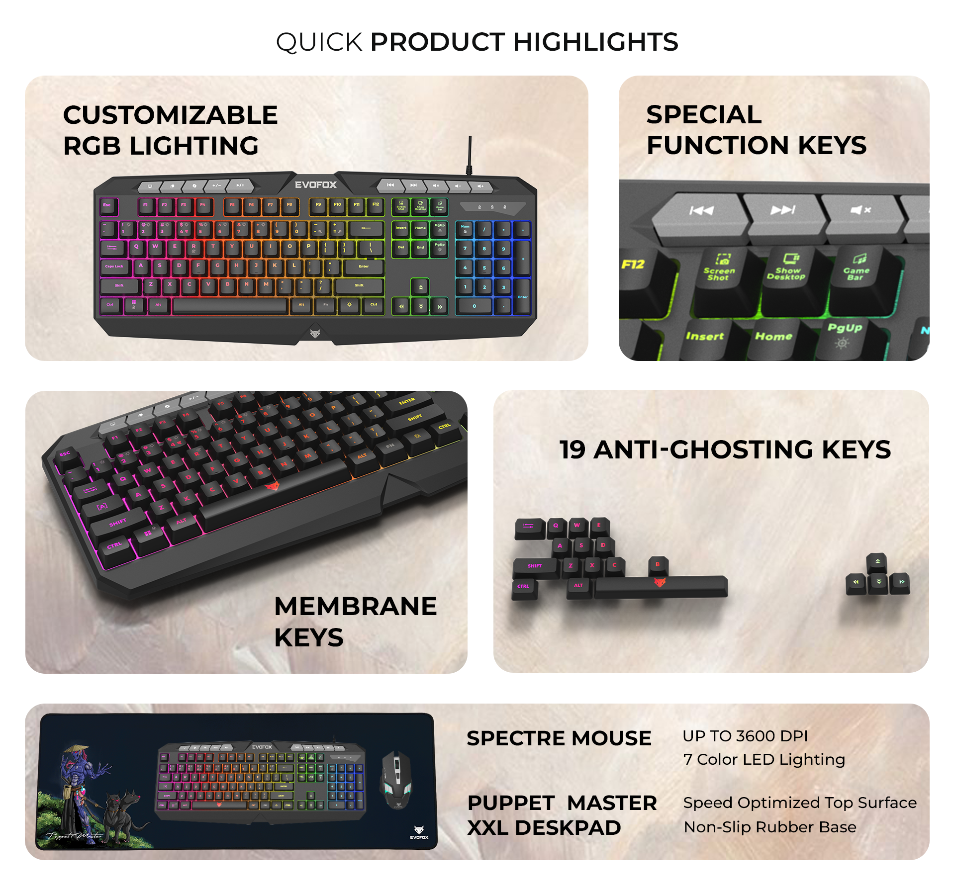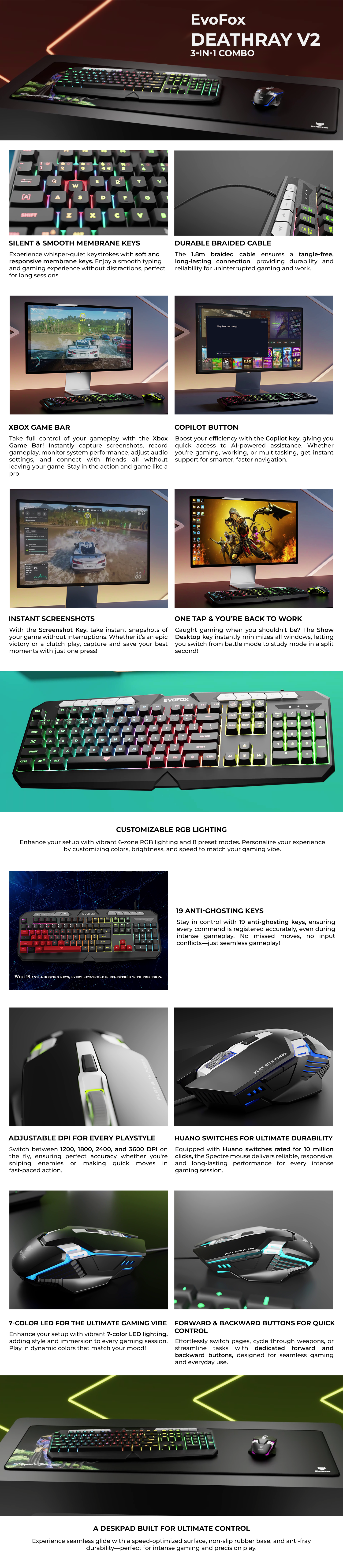 Dominate every match with the EvoFox Deathray V2! 6-Zone RGB, anti-ghosting keys, and a high-speed gaming mouse make it the ultimate gaming upgrade.