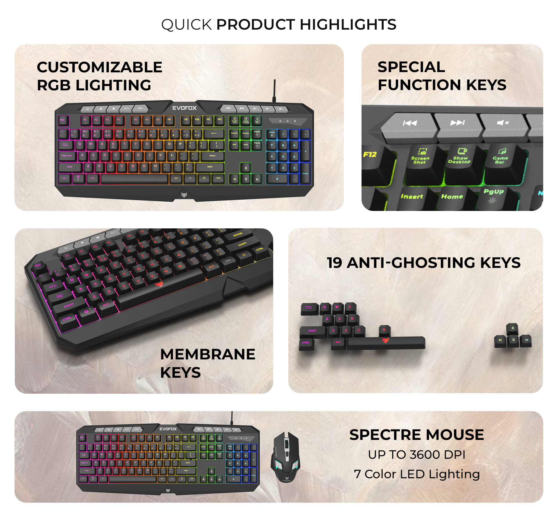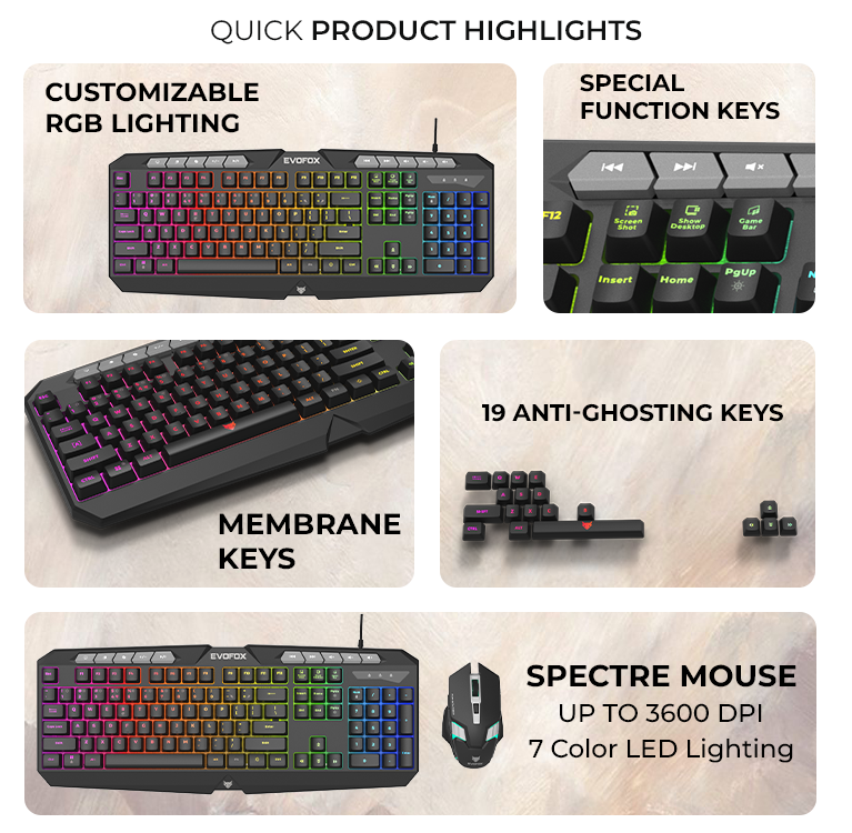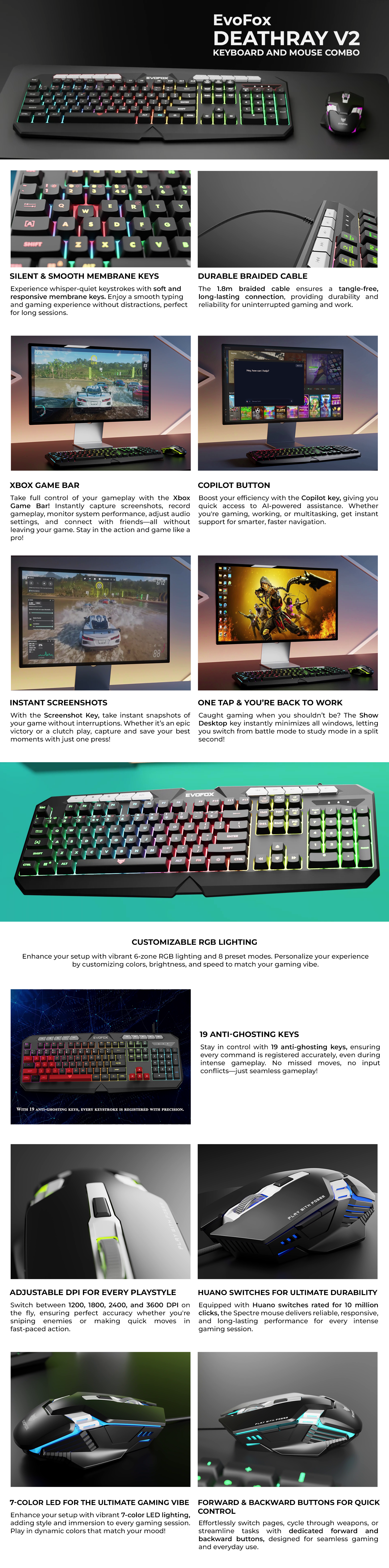 Dominate every match with the EvoFox Deathray V2! 6-Zone RGB, anti-ghosting keys, and a high-speed gaming mouse make it the ultimate gaming upgrade.