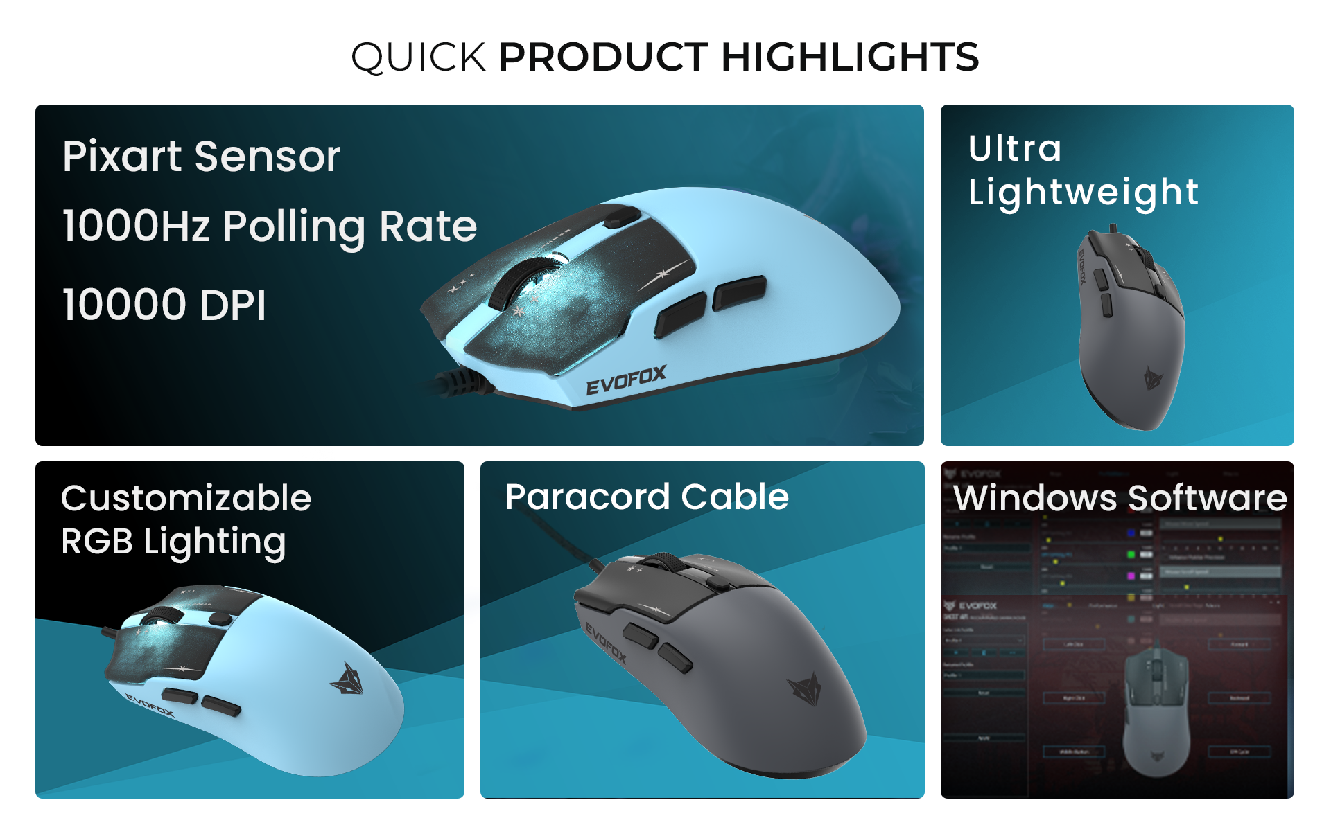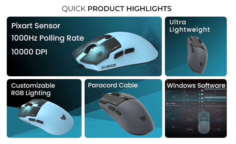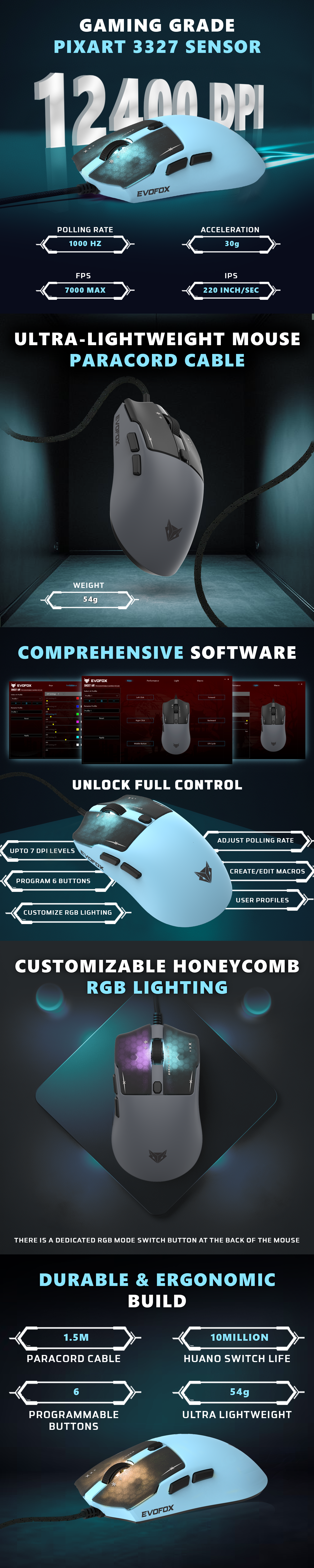 EvoFox Ghost Air โ Weighing just 54g, this gaming mouse offers 12400 DPI, 1000Hz polling rate, and Pixart 3327 sensor for unmatched speed and precision. Customize with RGB lighting, macros, and enjoy durable Huano switches with a tangle-free paracord cable for smooth, responsive gameplay.