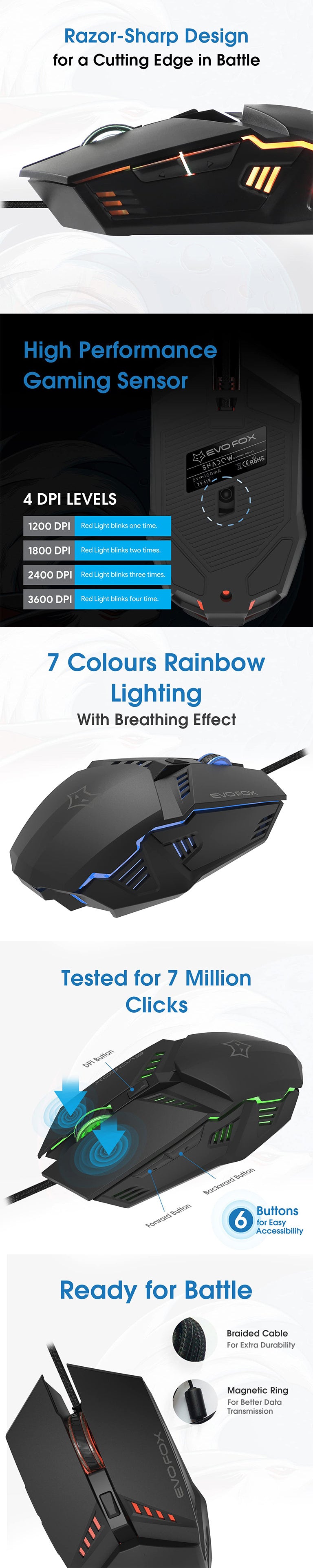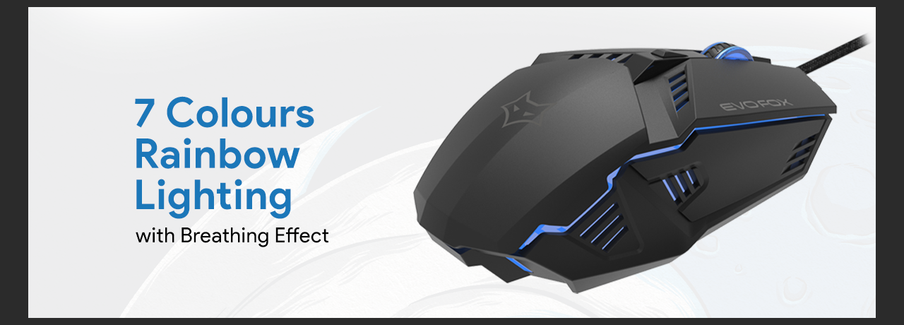 A. The EvoFox Shadow Gaming Mouse features 7-color rainbow lighting with a breathing effect. This adds a dynamic and visually appealing element to your gaming setup, and you can cycle through various colors to match your personal style.