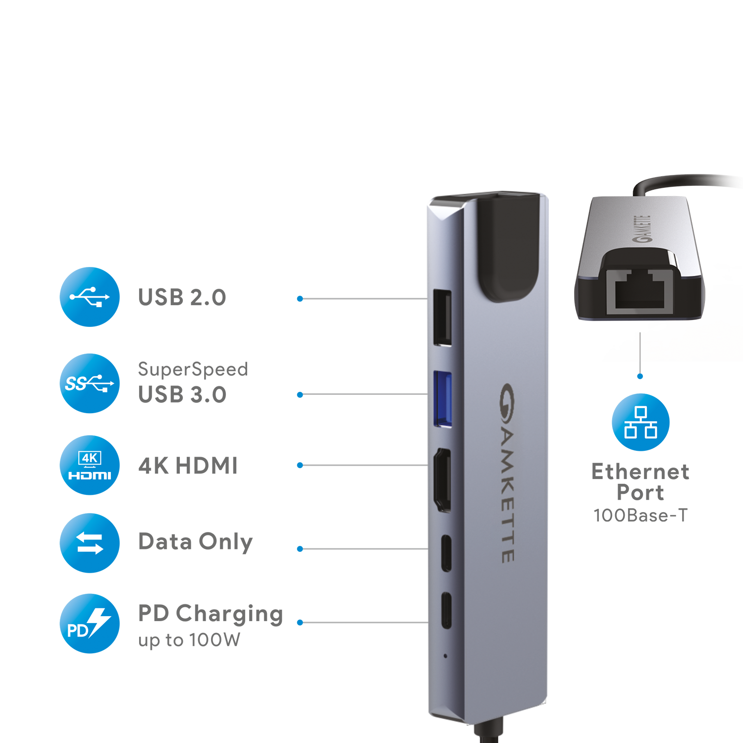 Q. How many Ports does the Type C 6 in 1 Ethernet Hub have and what are they used for?