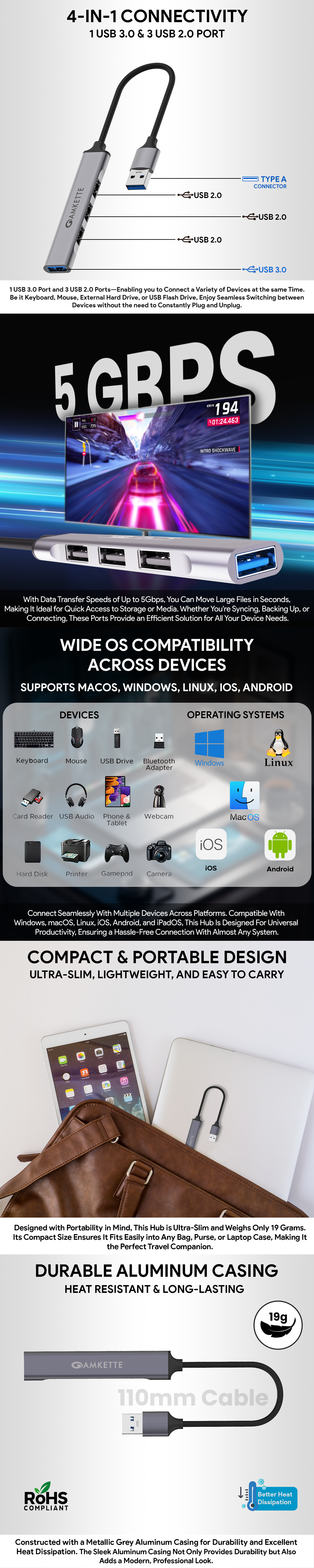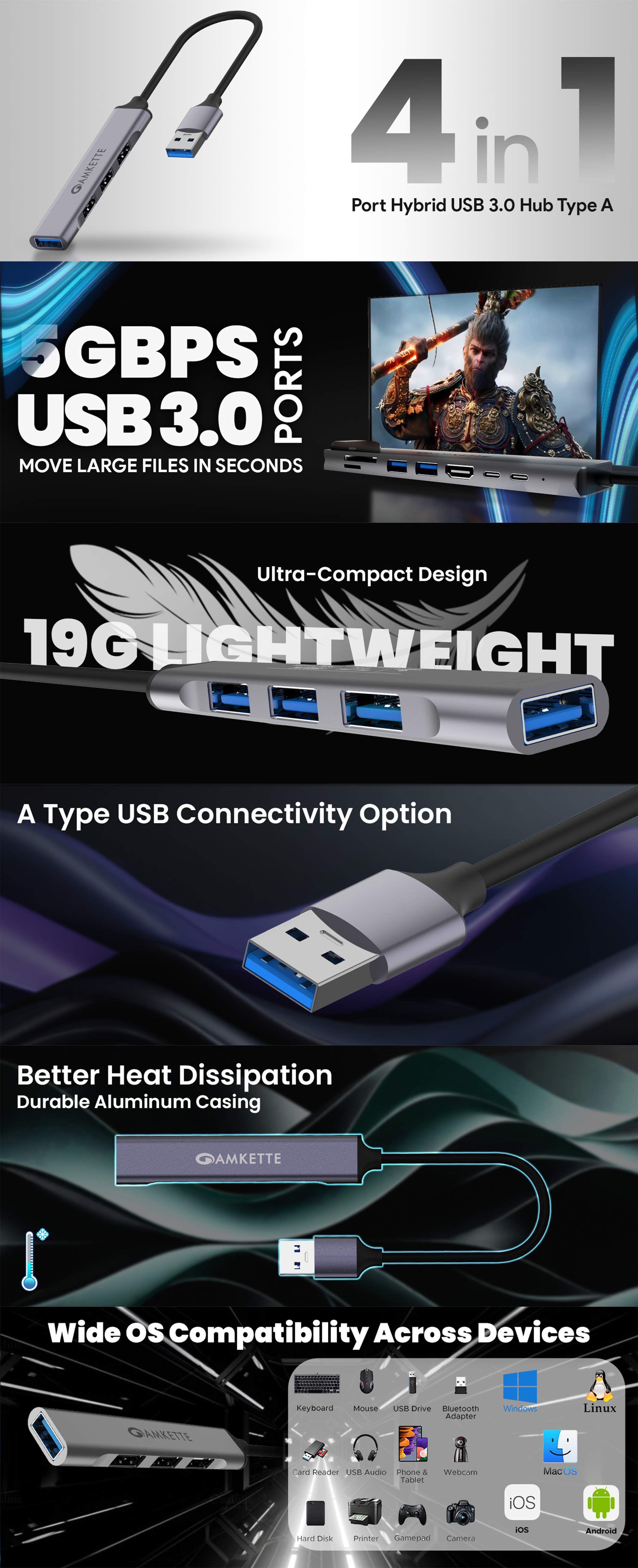 The hub measures 110 x 17.3 x 7.2 mm and weighs only 19g, making it highly portable and easy to carry.