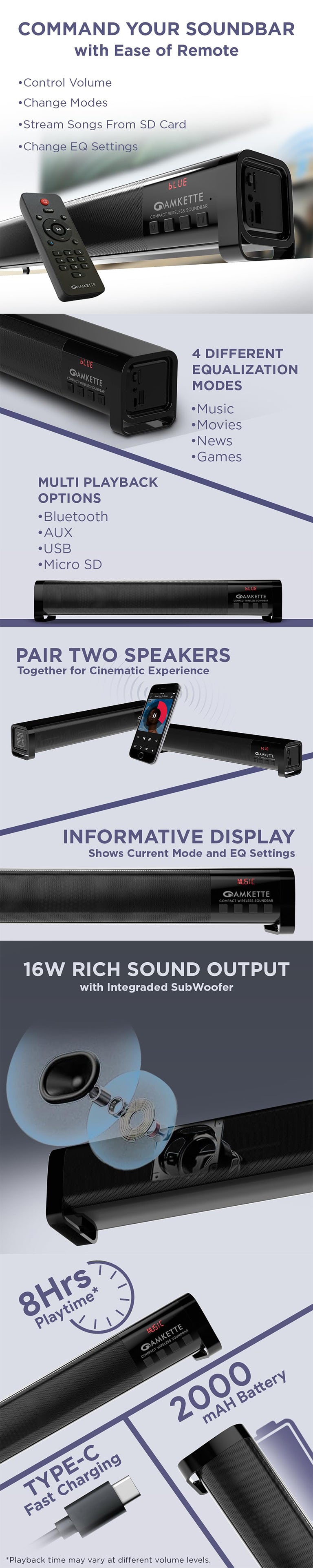 A. The Boomer Compact 16W Soundbar Pro have multiple playback options that include - Bluetooth/USB/SD/AUX/FM with 6 EQ Modes