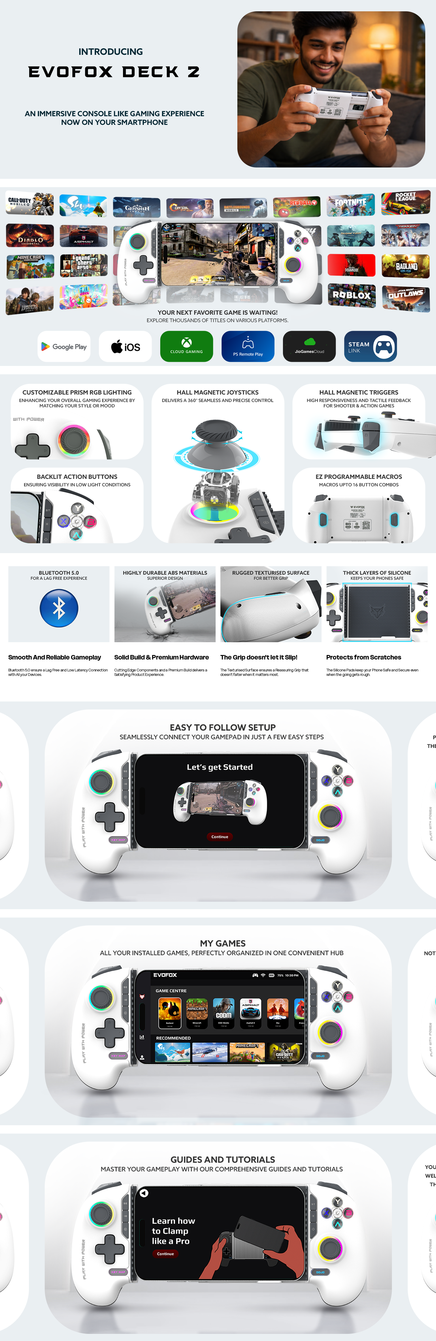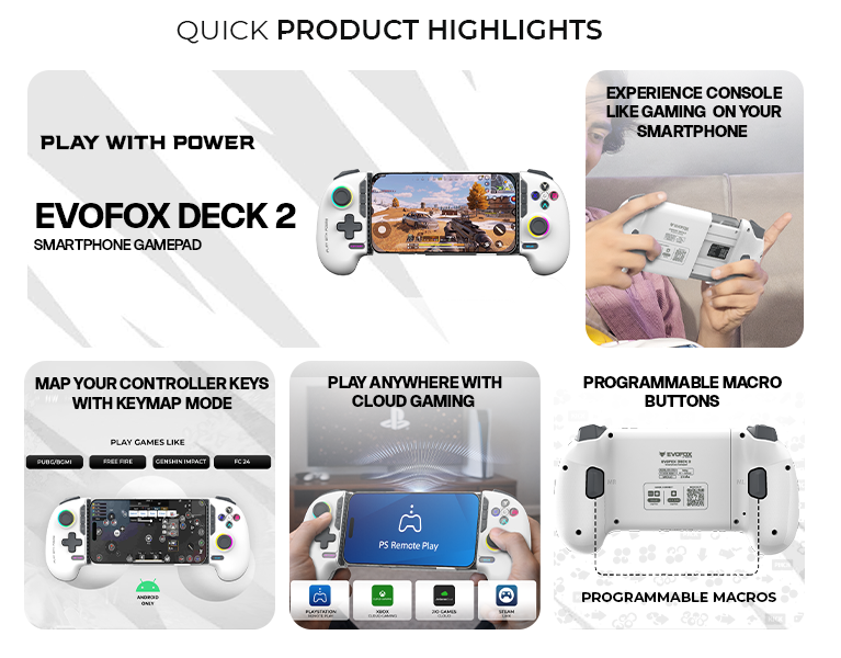 EvoFox Deck 2 Smartphone Gamepad with Hall Effect Triggers & Joysticks | Bluetooth Wireless Controller for Android, iOS, Windows, macOS & Nintendo Switch | Key Mapping, Macro Buttons, RGB Lighting