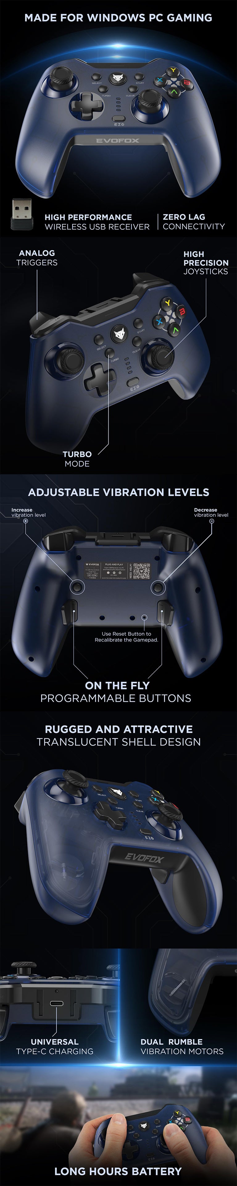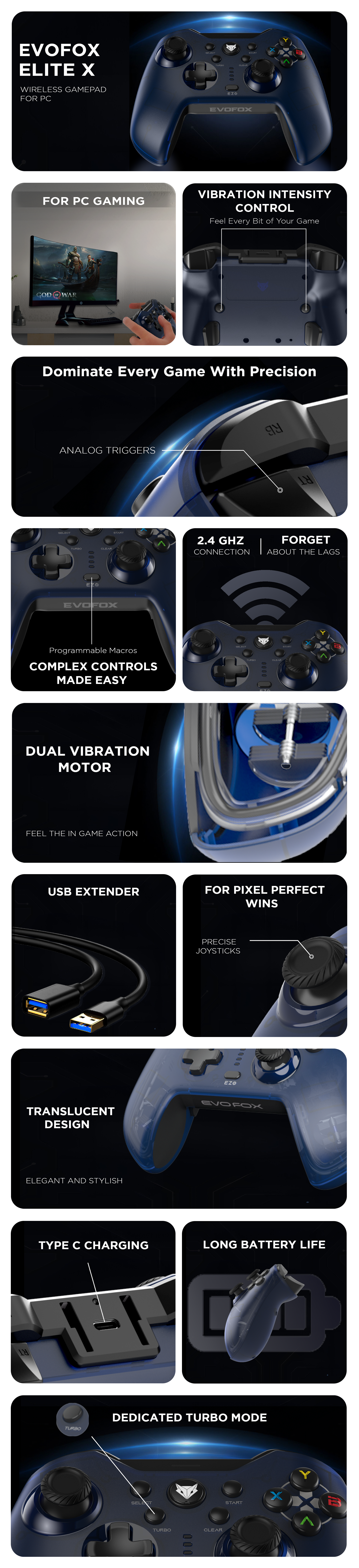A. Macros on the EvoFox Elite X Wireless Gamepad for PC is a powerful customization feature. They allow you to record and playback a series of button presses, creating shortcuts for complex in-game actions. For example, you can program a macro to execute a specific combo or perform repetitive tasks more efficiently. The gamepad offers you the flexibility to tailor macros to your gaming preferences, giving you an edge in your favorite games. Check out Manuals for more info.