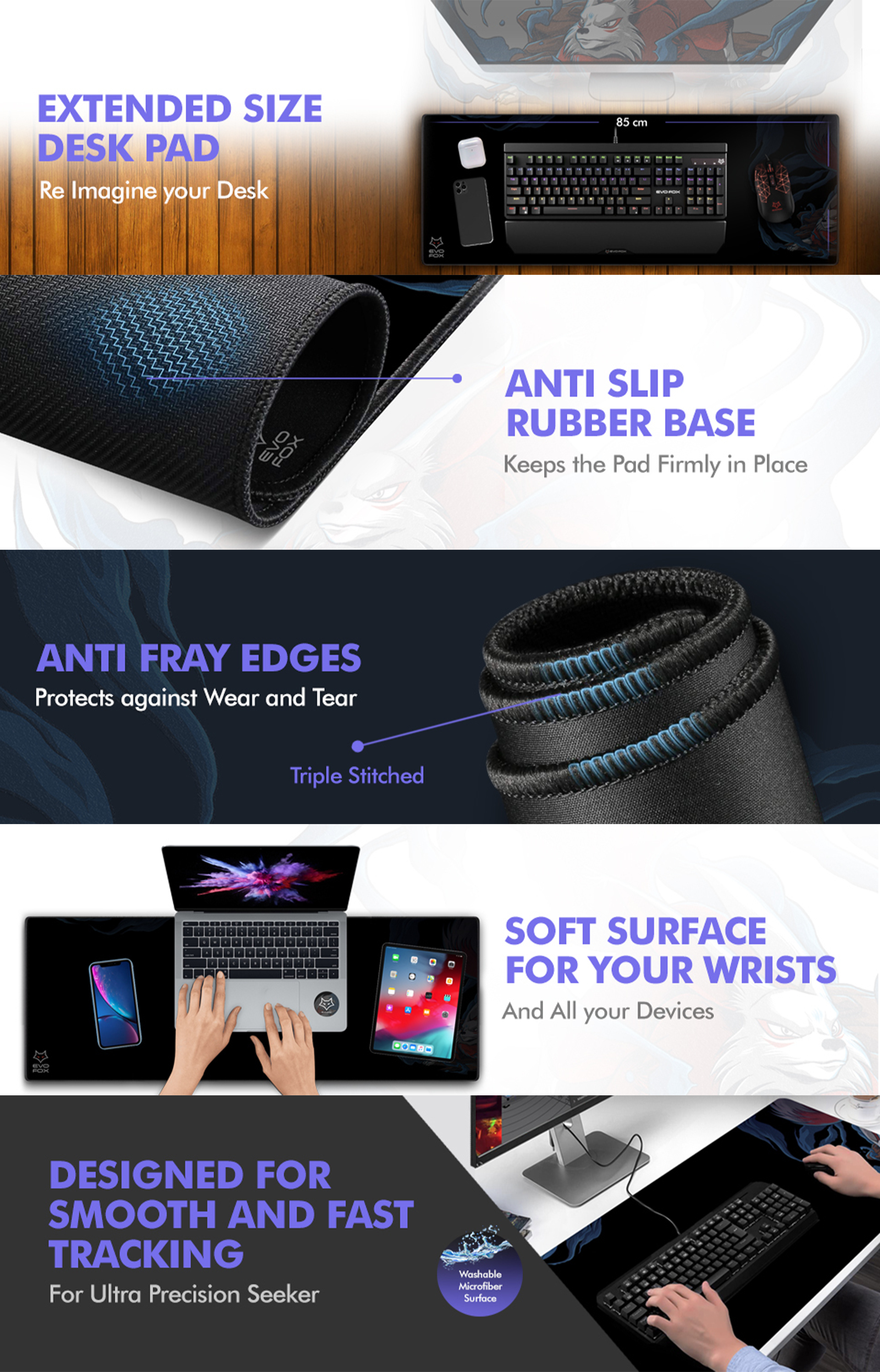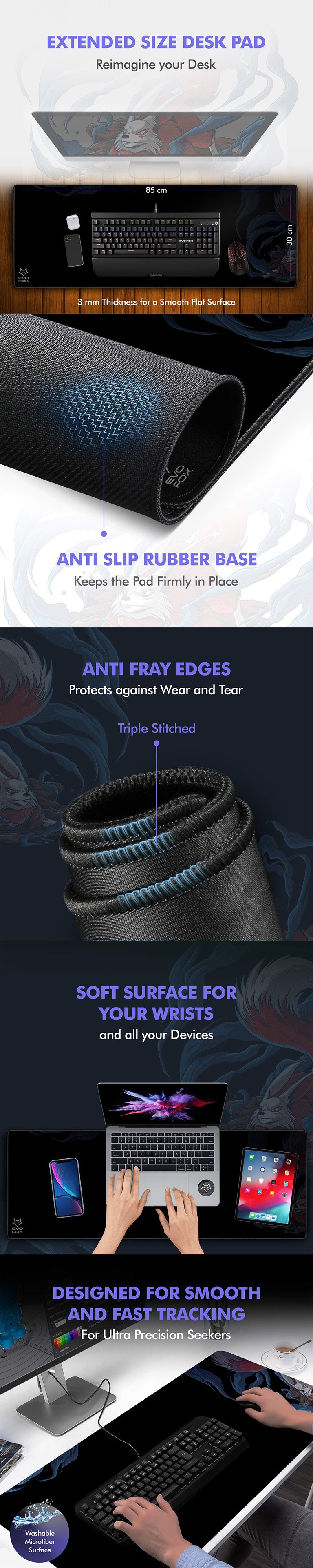 A. EvoFox Falcon X85 gaming desk pad offers smooth mouse movements, better precision, and protection for desk surface.