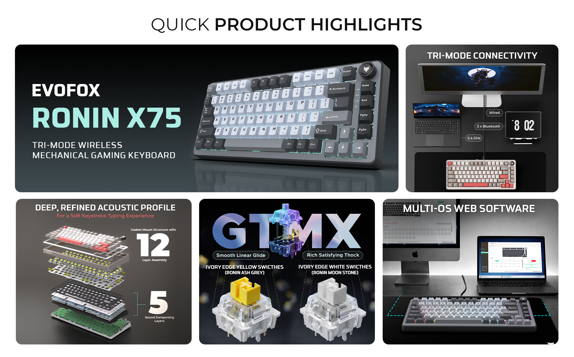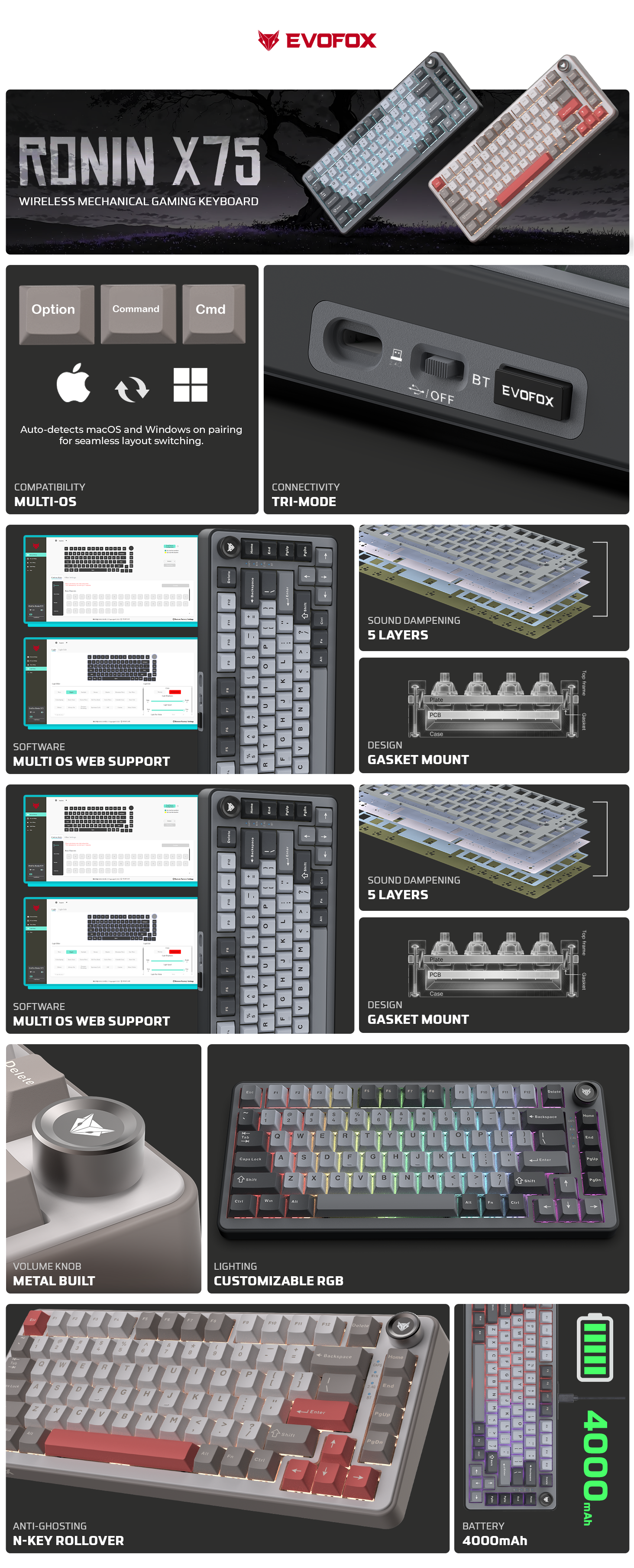 EvoFox Ronin X75 Tri-Mode Wireless Mechanical Gaming Keyboard