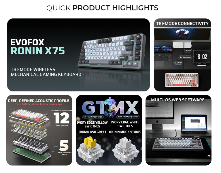 EvoFox Ronin X75 Tri-Mode Mechanical Gaming Keyboard | 12 Layer Gasket, 5 Layer Sound Dampening, Hot Swap GTMX Yellow/White Linear Switches,1000Hz Polling, Programmable, Muliti OS Web Software, Mac Key Caps