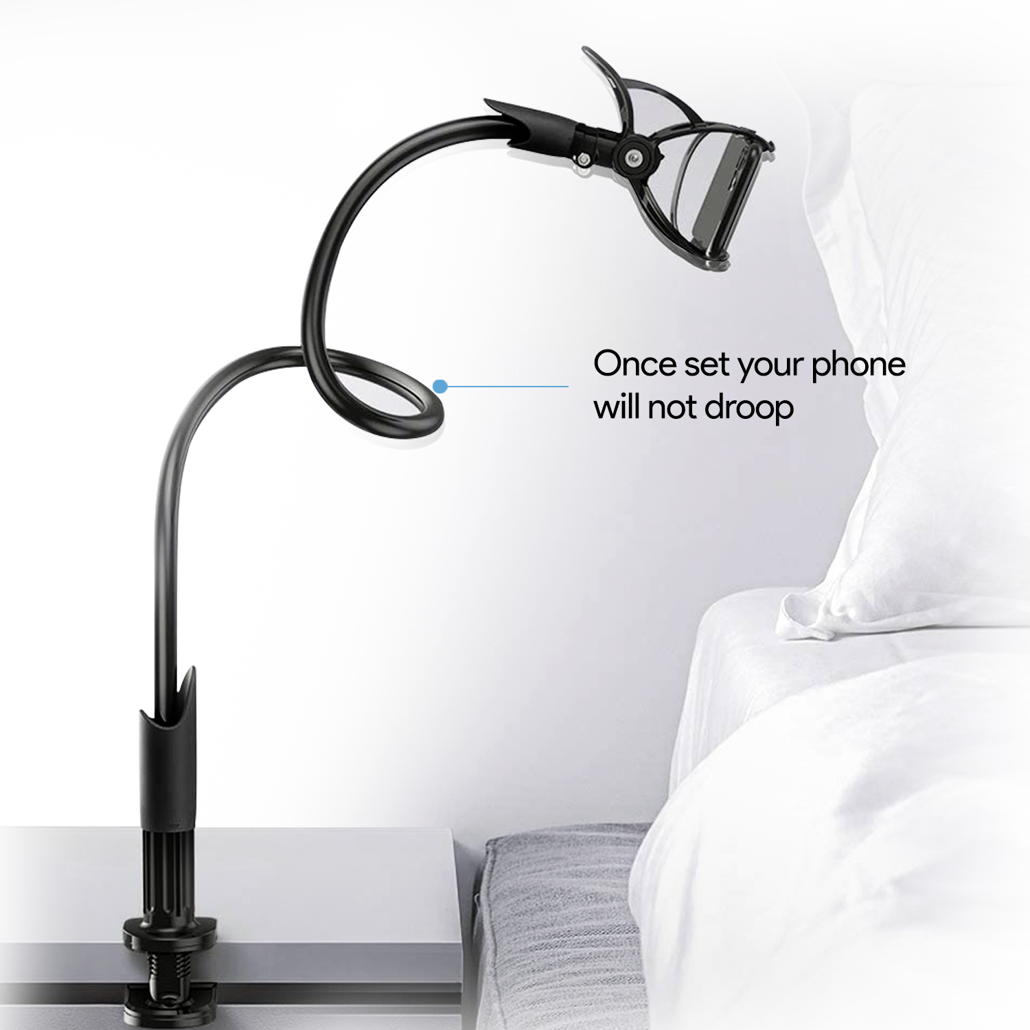 • The Flexi Phone Holder is a High Quality, Smartly Designed, and Extremely Flexible phone or device holder, that can securely clamp on to your Bed Frame, Headboard, Side Table, Desk, Kitchen Counter and more!