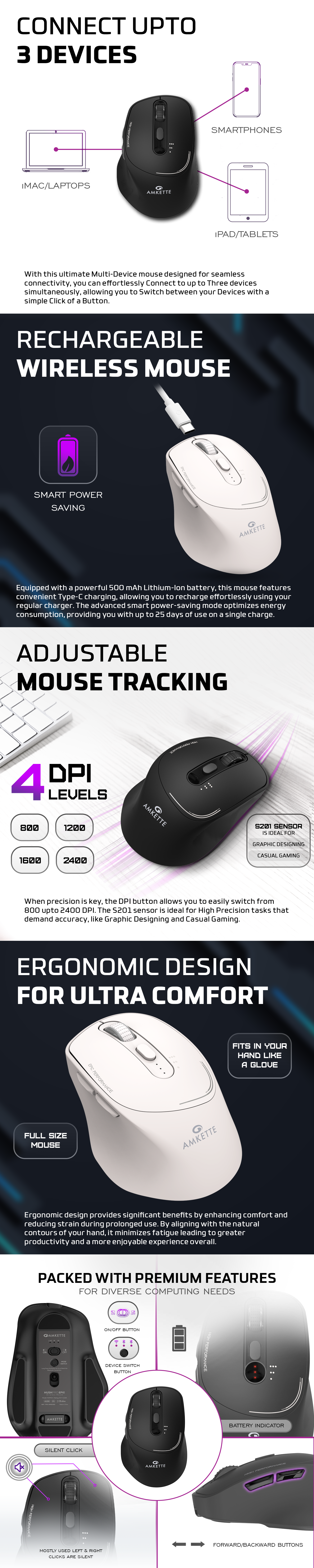 Meet the Amkette Hush Pro Epic Mouse—silent clicks, 2400 DPI, multi-device switching, and 120-hour battery life with Type-C charging for uninterrupted focus and comfort.