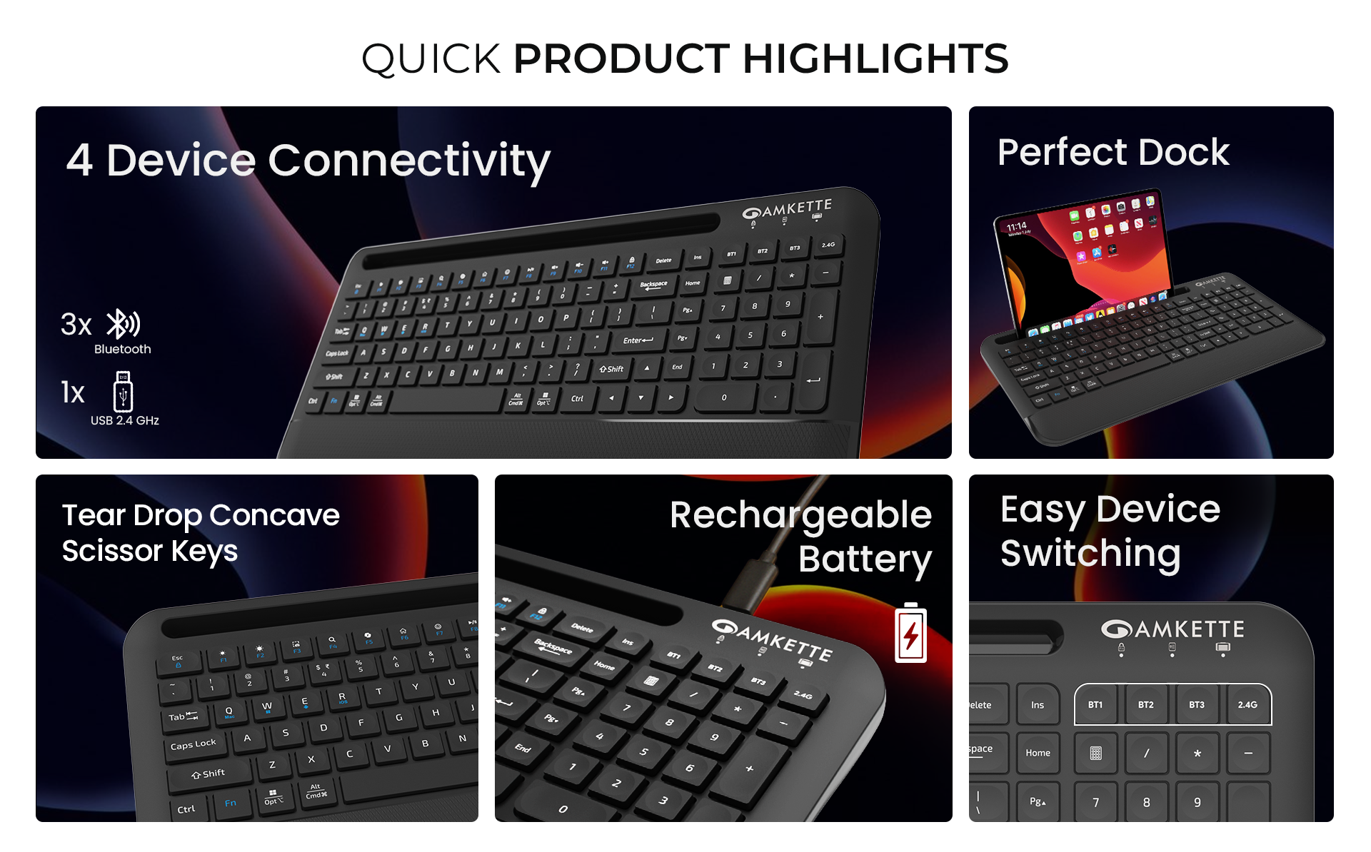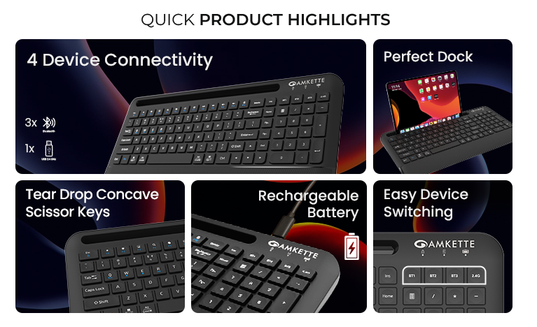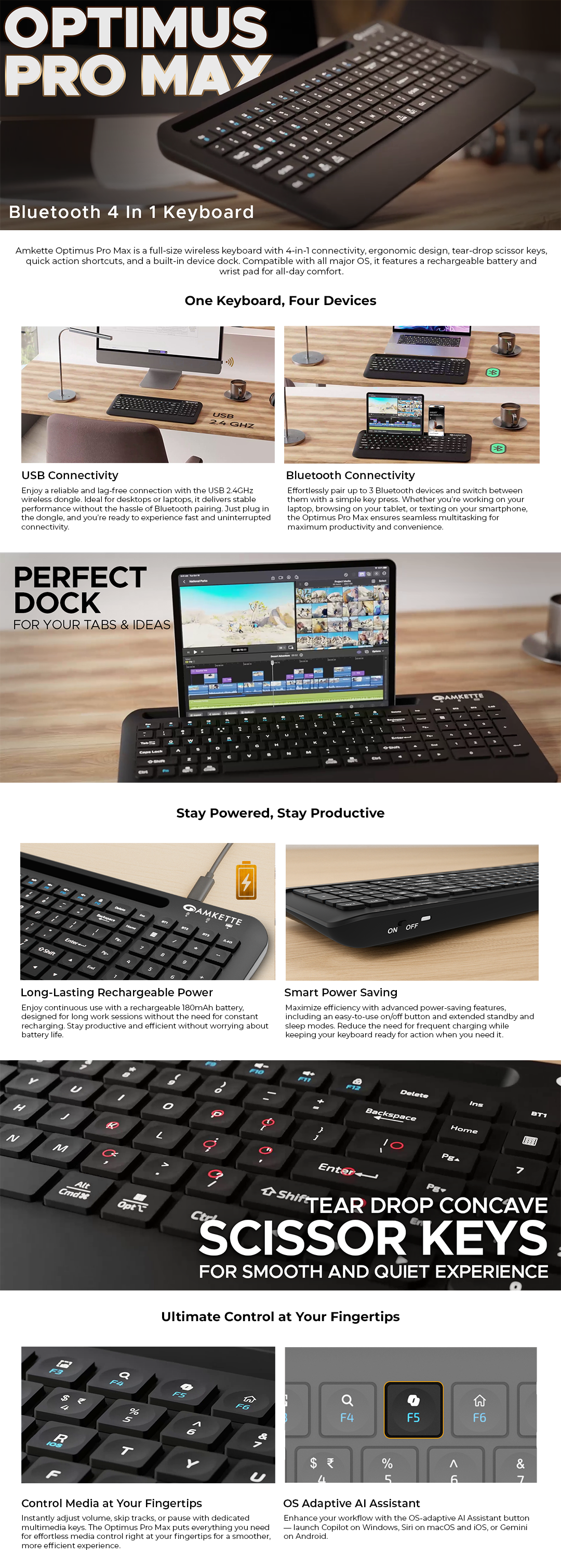 Switch effortlessly between Mac, Windows, iOS, and Android with the Amkette Optimus Pro Max wireless keyboard. Enjoy AI shortcut keys, multimedia controls, and a comfortable ergonomic design.