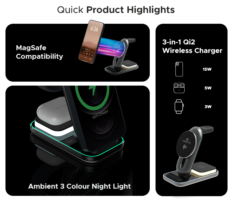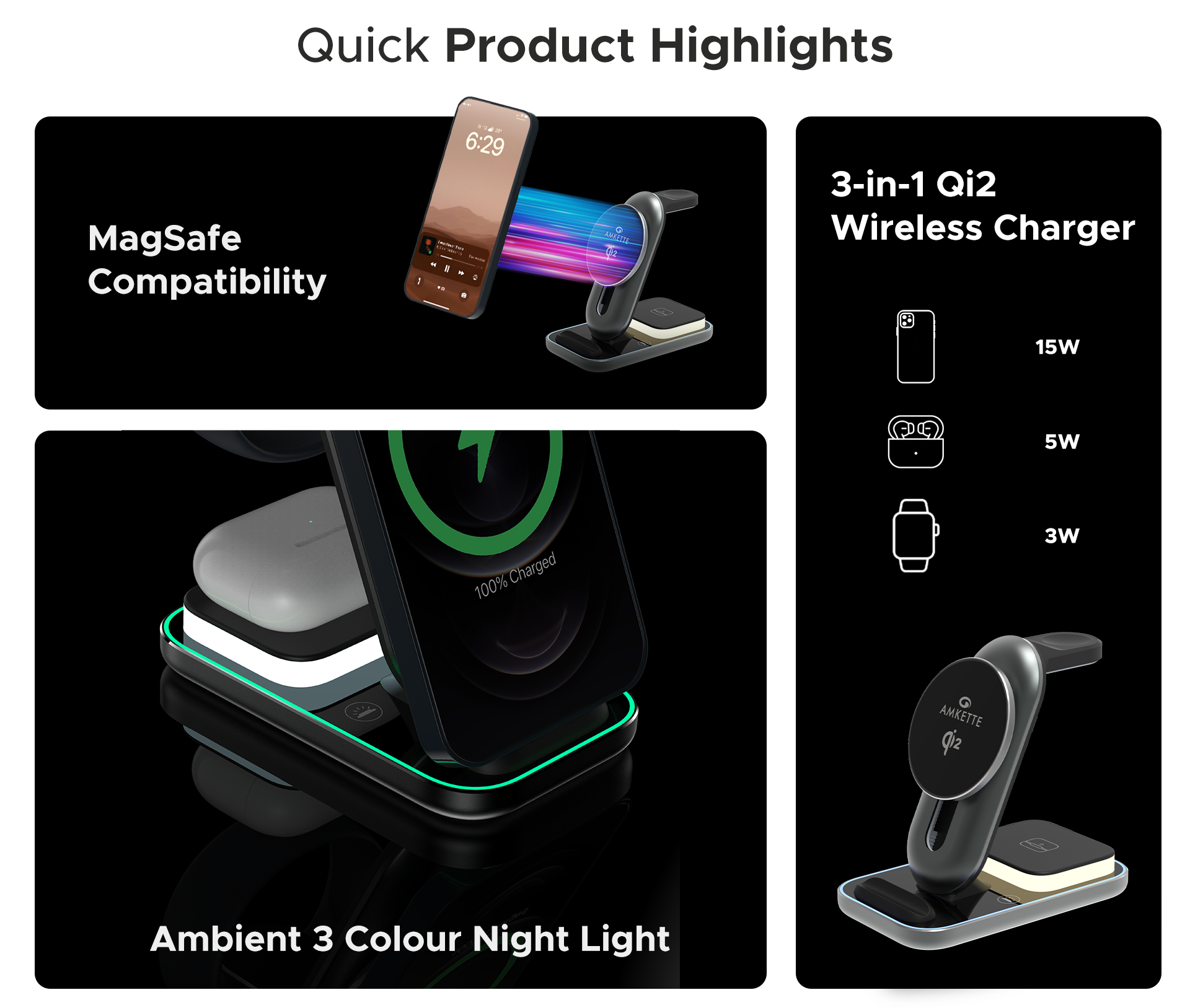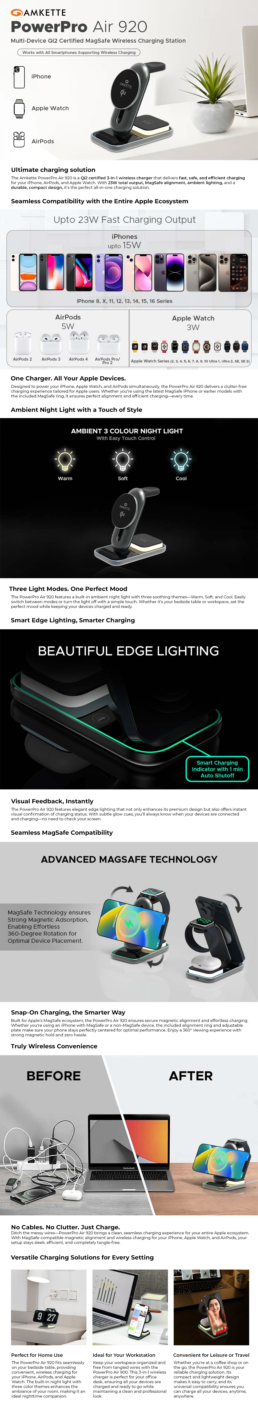 Charge smarter with the Amkette PowerPro Air 920 — a sleek 3-in-1 Qi2-certified MagSafe wireless charger for your iPhone, AirPods, and Apple Watch. Fast, safe, and perfect for your desk or nightstand.