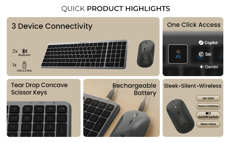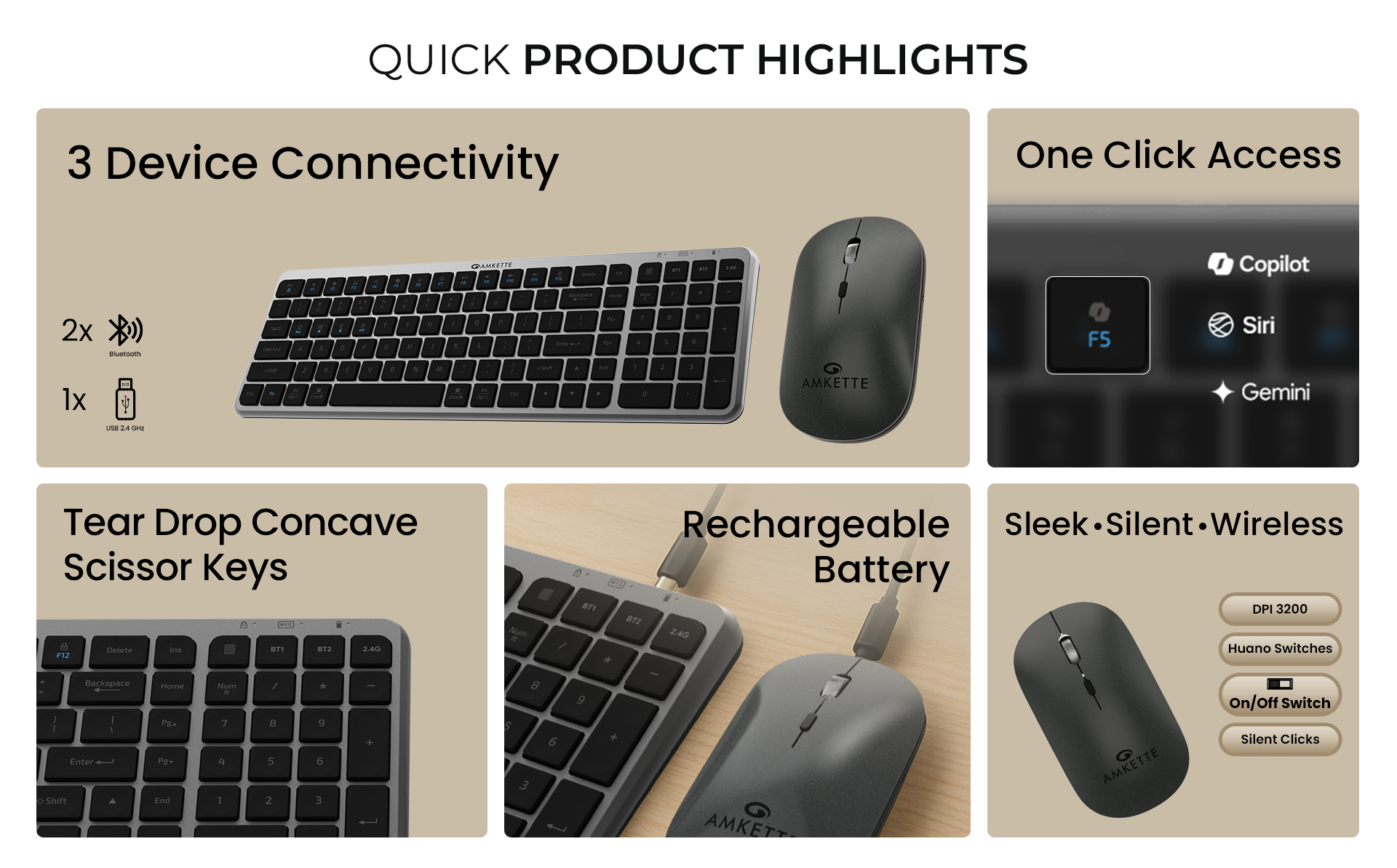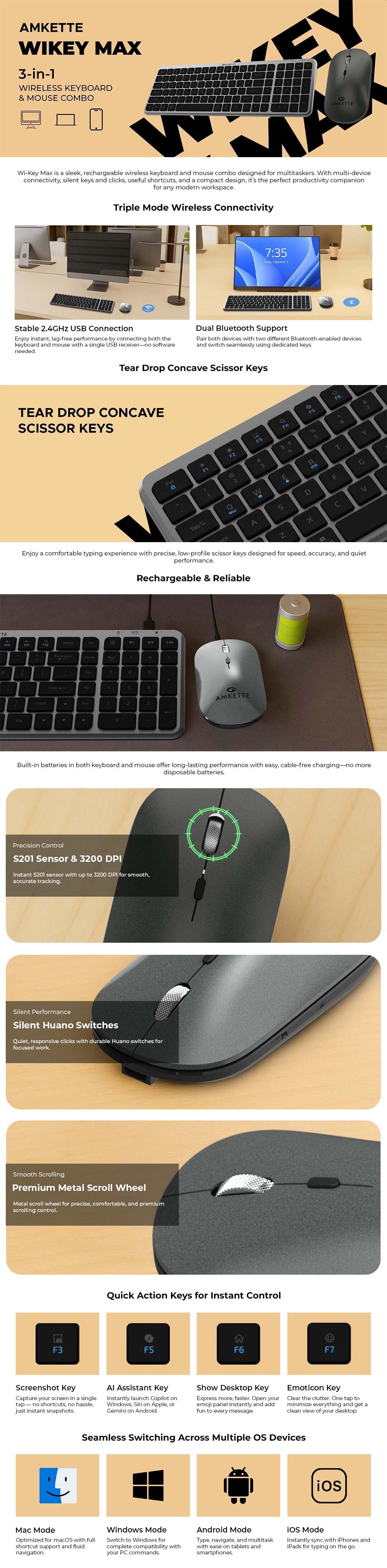 Amkette Wi-Key Max Wireless Keyboard & Mouse | 3 Device Switch | Silent | Rechargeable